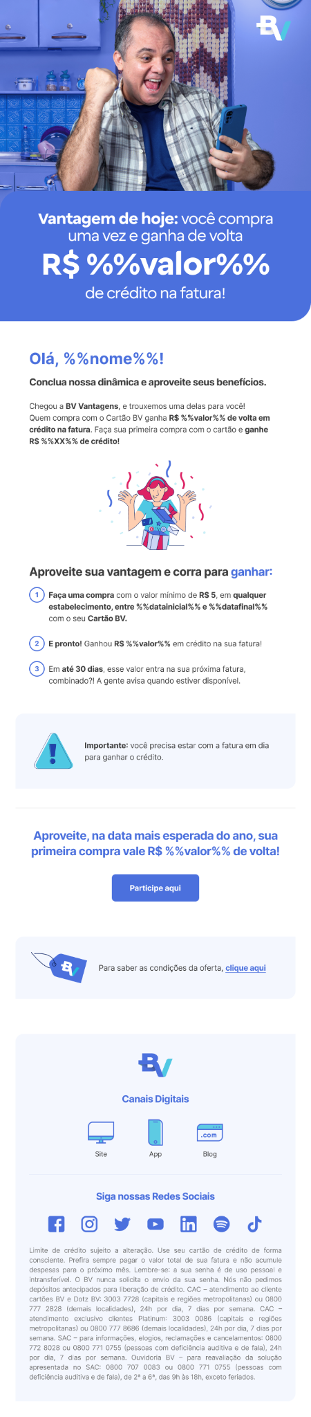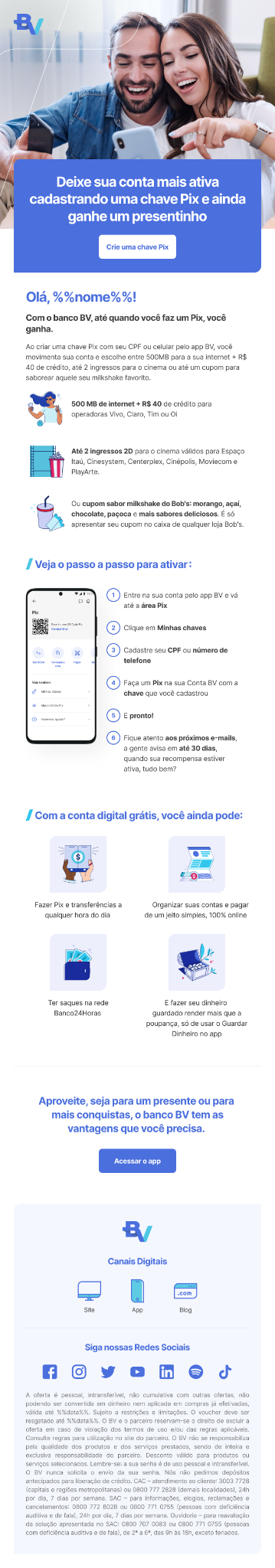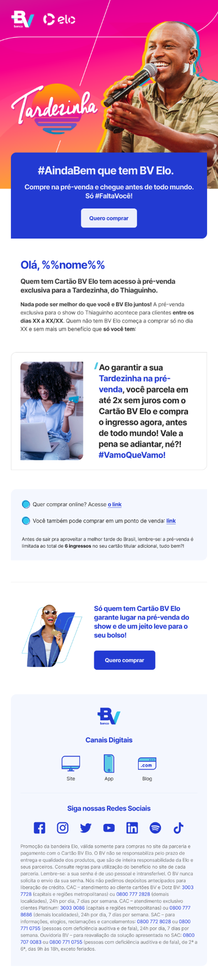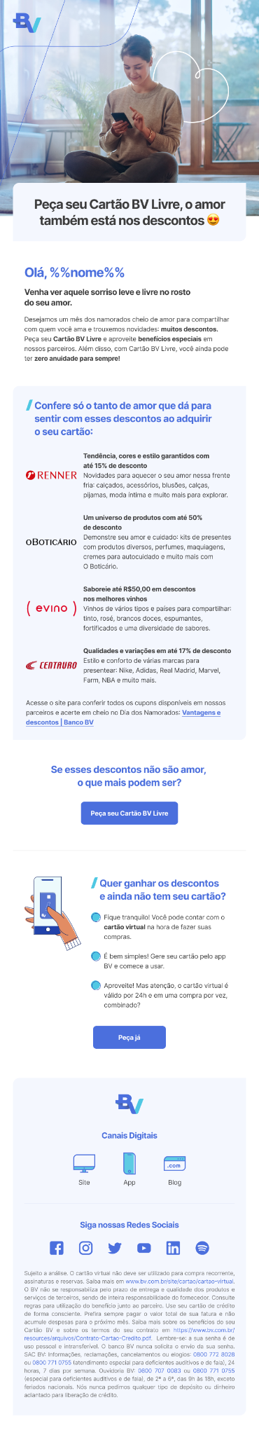 Por aqui, você encontra alguns KVS que já tive a oportunidade de criar e que até hoje são usados em todas as frentes do Banco BV. Além de algumas comunicações de E-mail Marketing feitas para eles, você pode assistir um dos projetos de reels do Banco em que eu mesma narrei. Sim, é a minha voz no primeiro vídeo! Legal, né?!